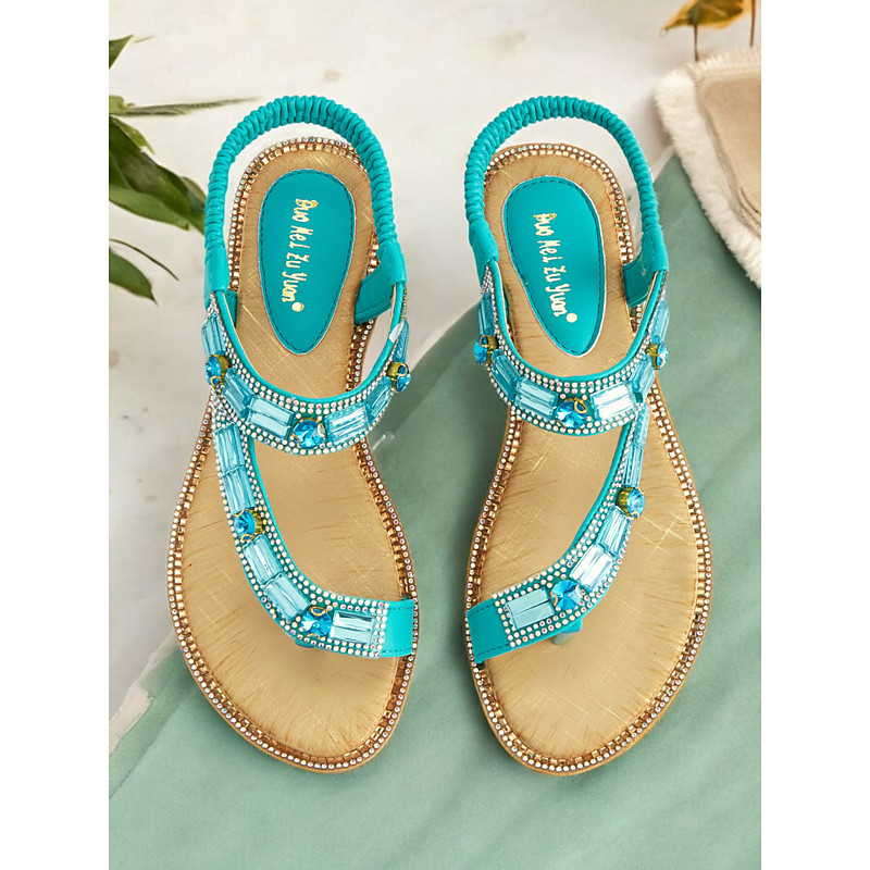 Women's Turquoise Rhinestone Embellished T-Strap Sandals – Bohemian Elastic Slingback Flat Sandals for Summer Beach Casual Wear