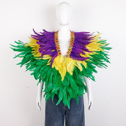 Accessori Samba del Carnevale 2026 Rio Carnevale Cappotto Sciarpa in Piume per Mardi Gras in Viola Verde Oro Poncho in Piume con Collare Gioiello per Donne Costume per Performance al Festival del