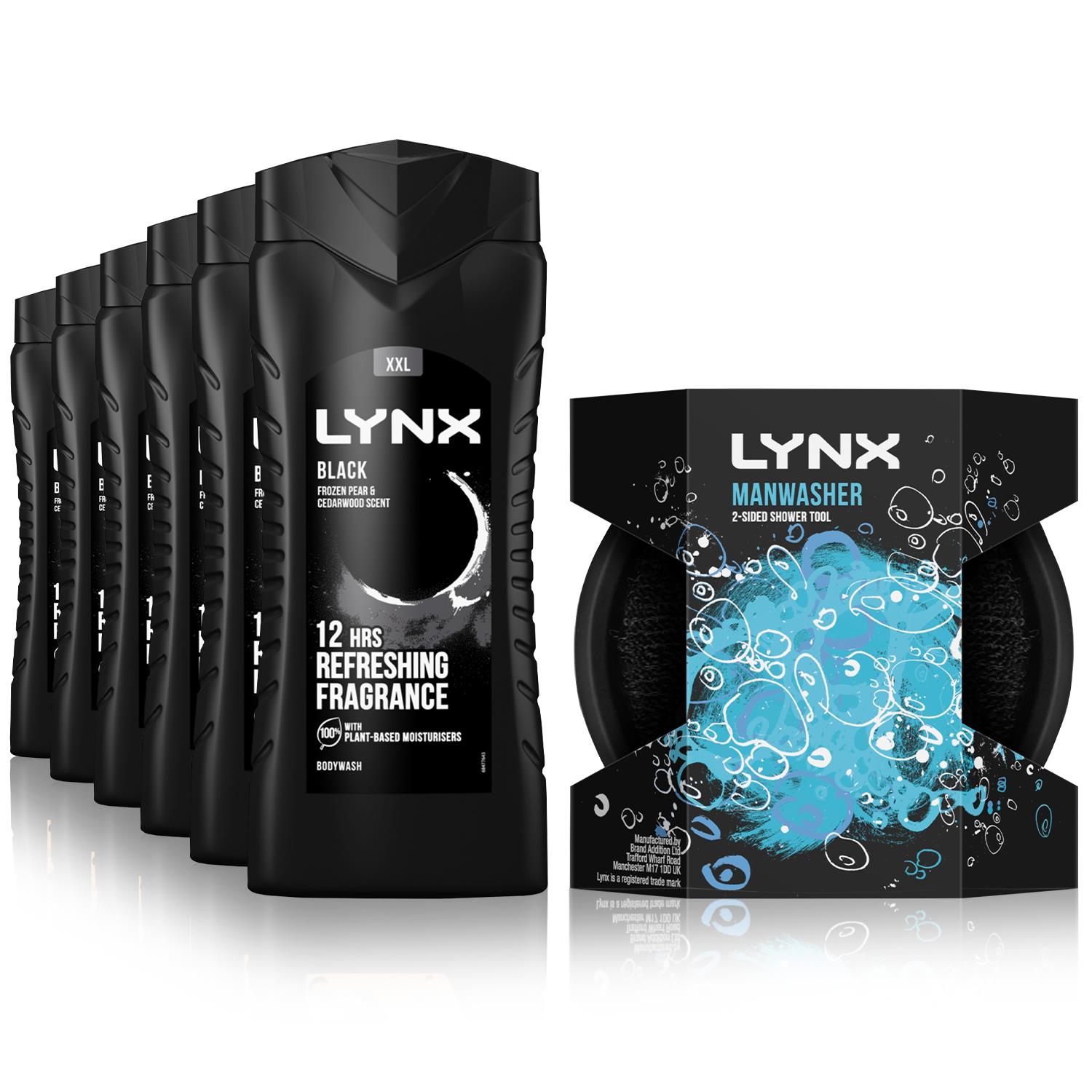 Lynx Mens 6x 12H Refreshing Shower Gel 500ml With Manwasher Scrubbing Showertool[buy 6 - Black + Manwasher] - One Size