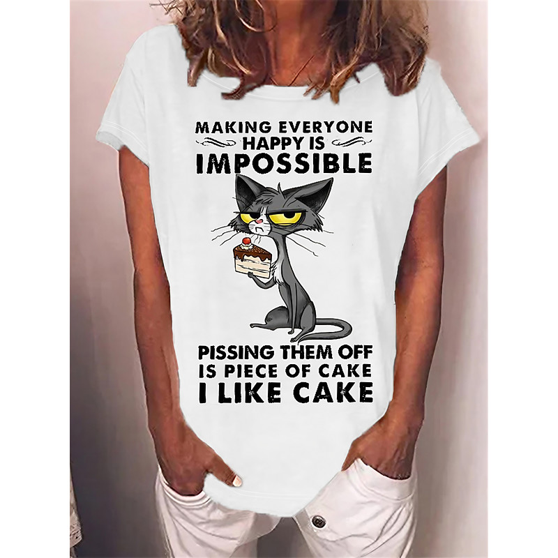 Women's T Shirt Cat Letter Text Basic Short Sleeve Round Neck Regular Tops Daily Weekend Print White Red Blue Green Gray Spring, Fall, Winter, Summer