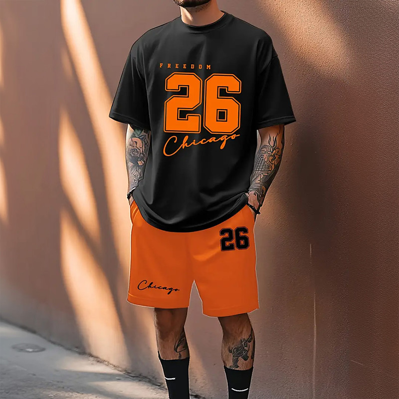 Men's Text / Number 2pcs Tees sets Summer Tops Short Sleeve Short Pants Crew Neck Vacation Casual Daily Outdoor Sport Daily 3D Print Summer Deep Green Black ash-colored