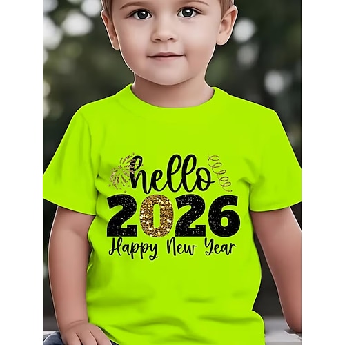 Jungen-T-Shirt mit 3D-Grafik und Buchstabenmotiv für die Neujahrsparty 2026, Kurzarm, Sommer/Frühling, Sportmode, Streetwear, Kindergröße 4-12 Jahre, Rundhalsausschnitt, normale Passform, geeignet für