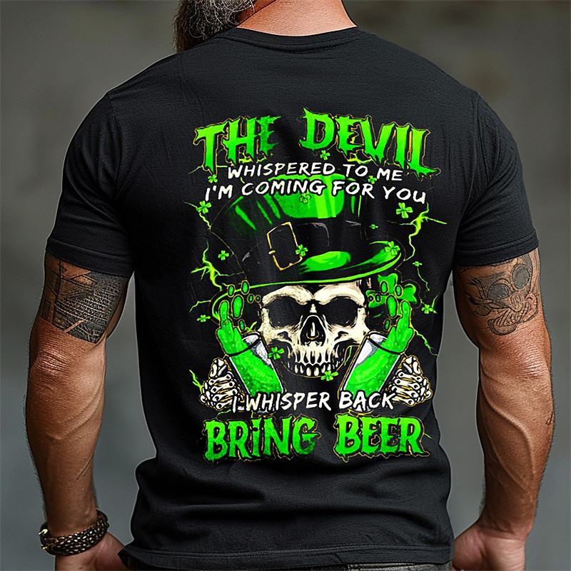 St Patricks Day Mens T Shirt The Devil Whispered To Me I Am Coming For You I Whisper Back Bring Beer Skull Shamrock Graphic Tee Short Sleeve Black Top Clothing Apparel S M L XL XXL XXXL
