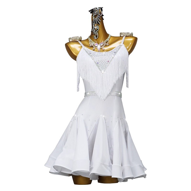 Latin Dance Dress Rhinestone Pearls Tassel Women's Performance Training Sleeveless Spandex