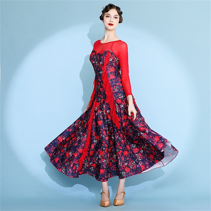 Floral Print Ballroom Dance Dress for Women - Long Sleeve A-Line Gown with Sheer Mesh Sleeves for Competitions, Latin, and Dance Events