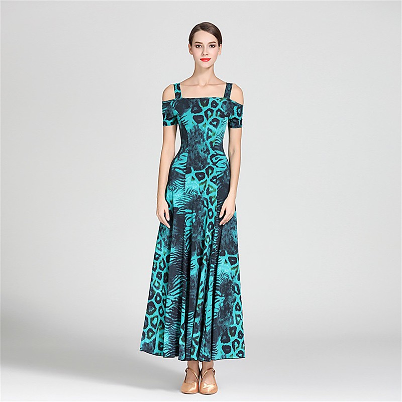 Animal Print Off-Shoulder Ballroom Dance Dress for Women - Long Sleeve A-Line Gown for Competitions, Latin, and Dance Events