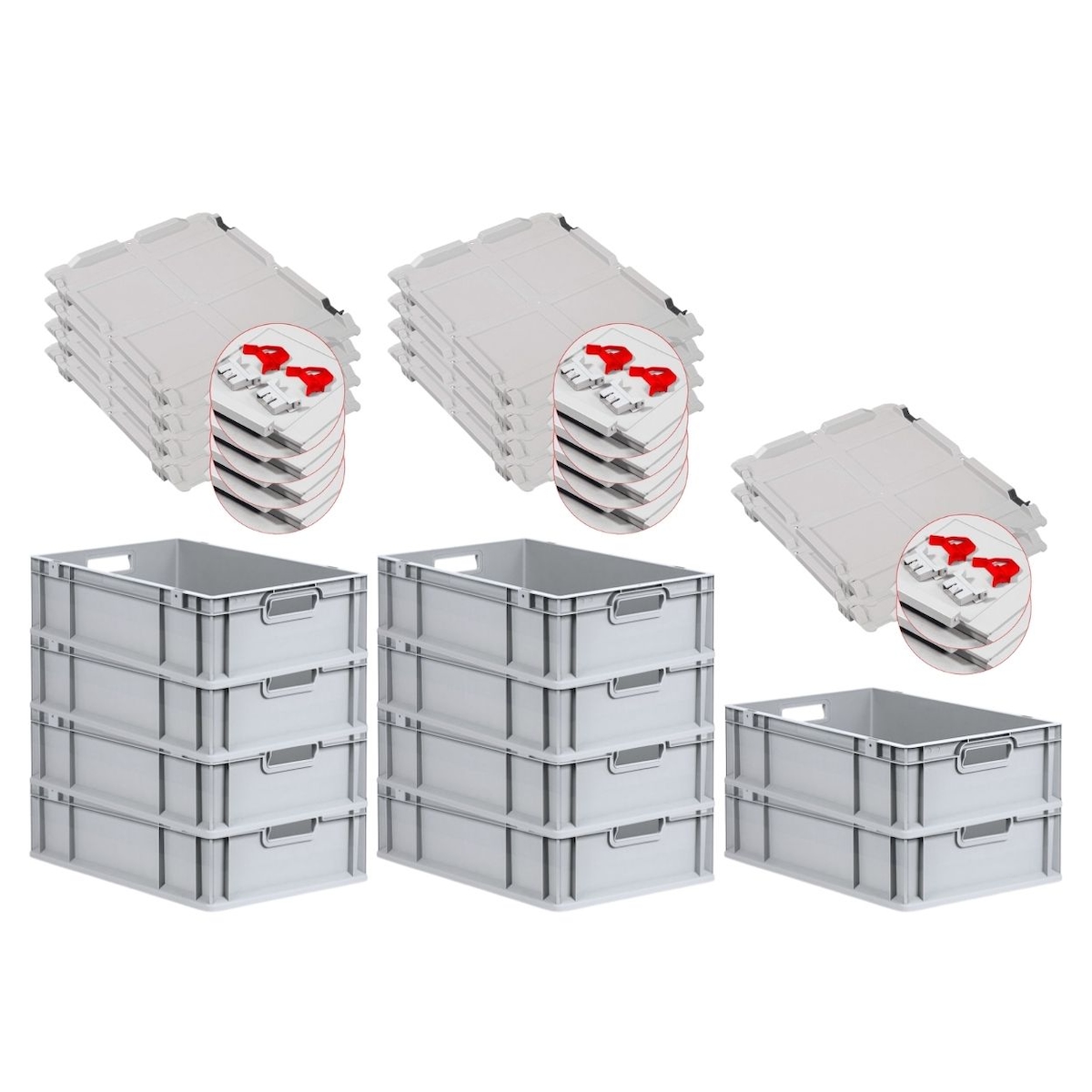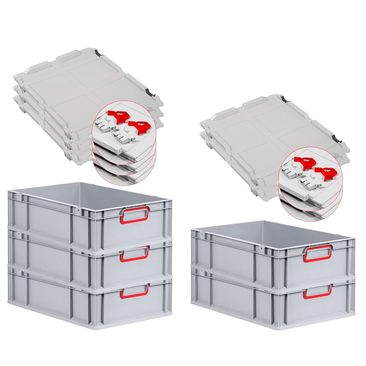 PROREGAL 10x Eurobox NextGen Grip mit Scharnierdeckel & roten Verschlüssen | HxBxT 17x40x60cm | 34 Liter | Griffe offen | Glatter Boden