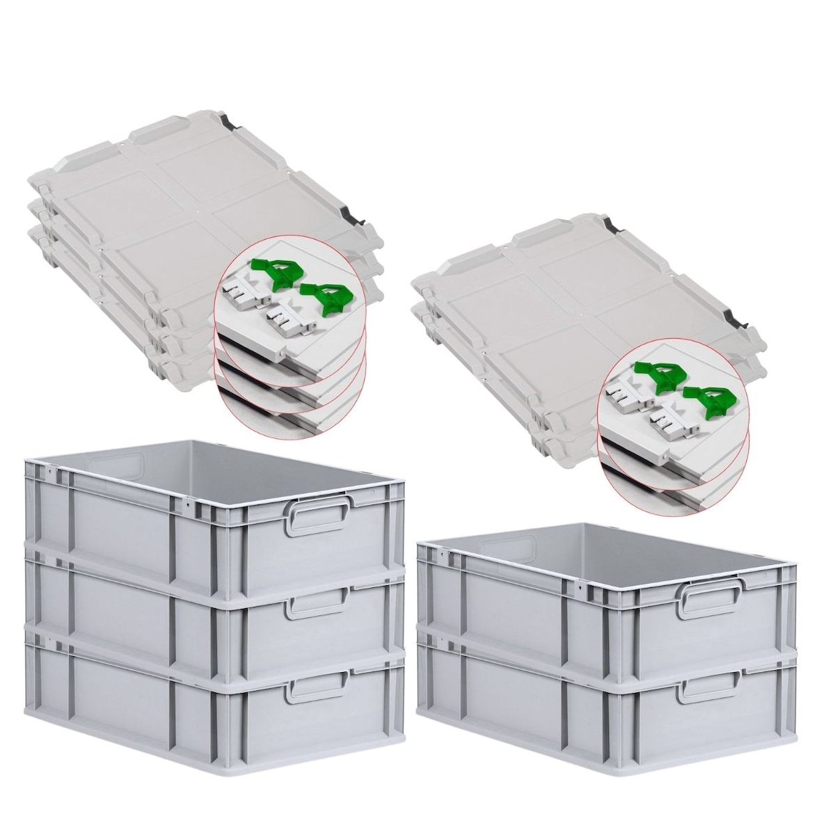 PROREGAL 5x Eurobox NextGen Grip mit Scharnierdeckel & grünen Verschlüssen | HxBxT 17x40x60cm | 34 Liter | Griffe geschlossen | Glatter Boden