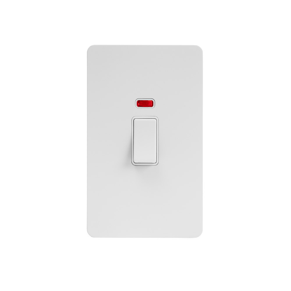 Soho Lighting White Metal Flat Plate 45A 1 Gang Double Pole Switch With Neon - Large Plate Wht Ins Screwless
