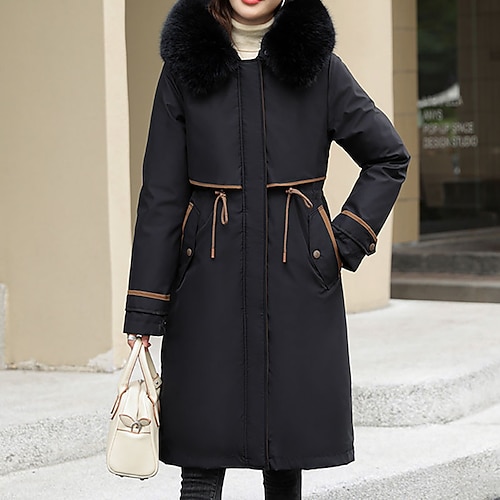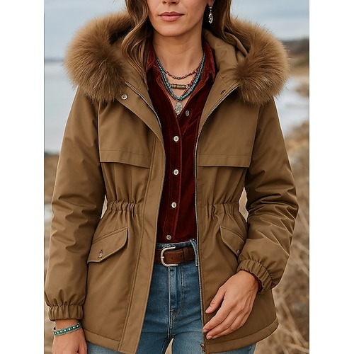 Women's Parka Comfortable Breathable Pocket Buttons Fur Collar Casual Plain Vacation Street Casual Daily Wear Zipper Regular Hooded Regular Fit Long Sleeve Outerwear Black Wine Khaki Spring Fall