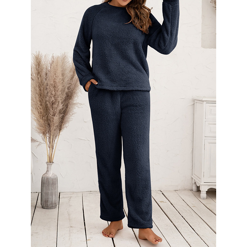 Women's Pajamas Loungewear Fuzzy Fleece Flannel Pajama Set Casual Pure Color Elastic Waist Pant Vacation Home Daily Long Sleeve Crew Neck White Pink Royal Blue Purple Khaki Fall Winter Loose Fit