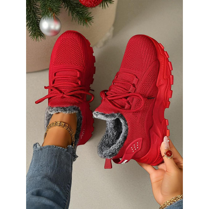 Women's Red Fleece Lined Sneakers - Warm Knit Casual Shoes with Non-Slip Sole, Comfortable Christmas Footwear for Winter Walking and Travel