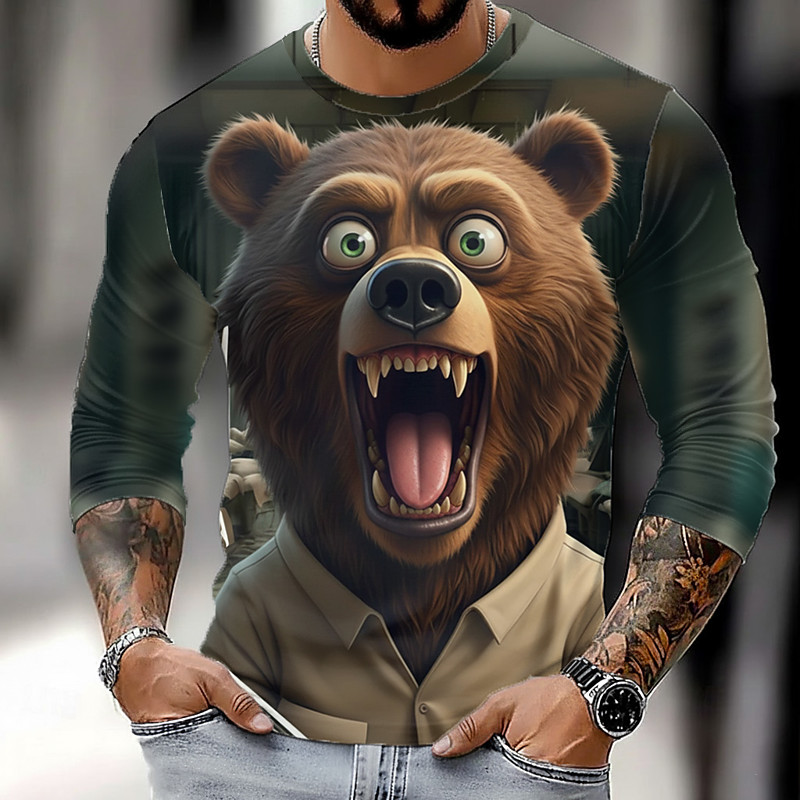 Men's Bear T Shirt Long Sleeve T shirt 3D Print Crew Neck Shirt Fashion Basic Street Casual Daily Black Brown Summer Spring Clothing Apparel S M L XL XXL XXXL