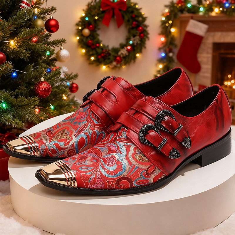 Men's Red Genuine Leather Monk Strap Dress Shoes with Paisley Print and Metal Toe Cap, 100% Cowhide Formal Party Shoes for Stage and Evening Fashion