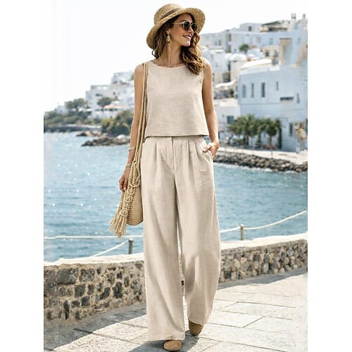 Per donna Set di Pantaloni Finto cotone e lino Senza Maniche Girocollo Semplice Elegante Moda Streetwear Casuale Quotidiano All'aperto Blu Nero Arancione Estate Vestibilità comoda