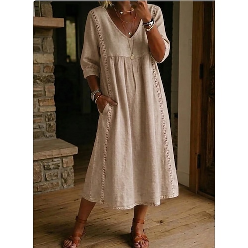 Per donna Abito Midi Finto cotone e lino Vestito Estivo Abito a trapezio Abito Estivo Vacanza Festa Casual Quotidiano Ufficio Spiaggia Vestibilità comoda Semplice Mezza Manica Scollo a V Blu chiaro