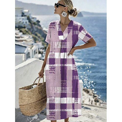 Per donna Abito Midi Abito a Tubino Vestito Estivo Vacanza Casual Spiaggia Quotidiano Uscire Vestibilità comoda Grafico Geometrico Manica Corta Scollo a V Blu Verde chiaro Viola Verde Estate Primavera