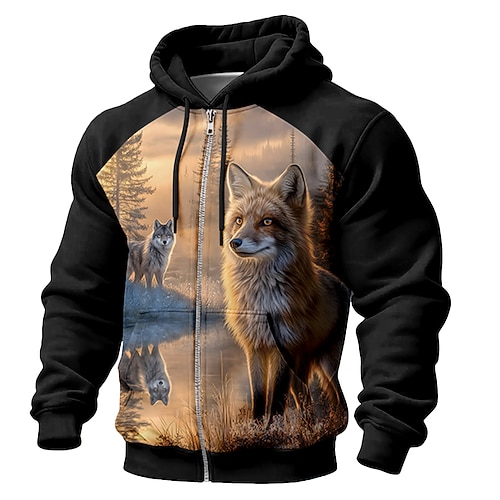 Felpa con cappuccio da uomo con zip, grafica realistica di volpe, fauna selvatica, tramonto, foresta, natura, riflesso, giacca con cappuccio, abbigliamento nero, s m l xl xxl xxxl