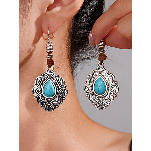 Damen-Ohrhänger im Bohemian-Stil mit Blumen und türkisfarbenem Stein, Vintage-Ohrhänger aus Legierung für Freizeitkleidung, Strand und Partys