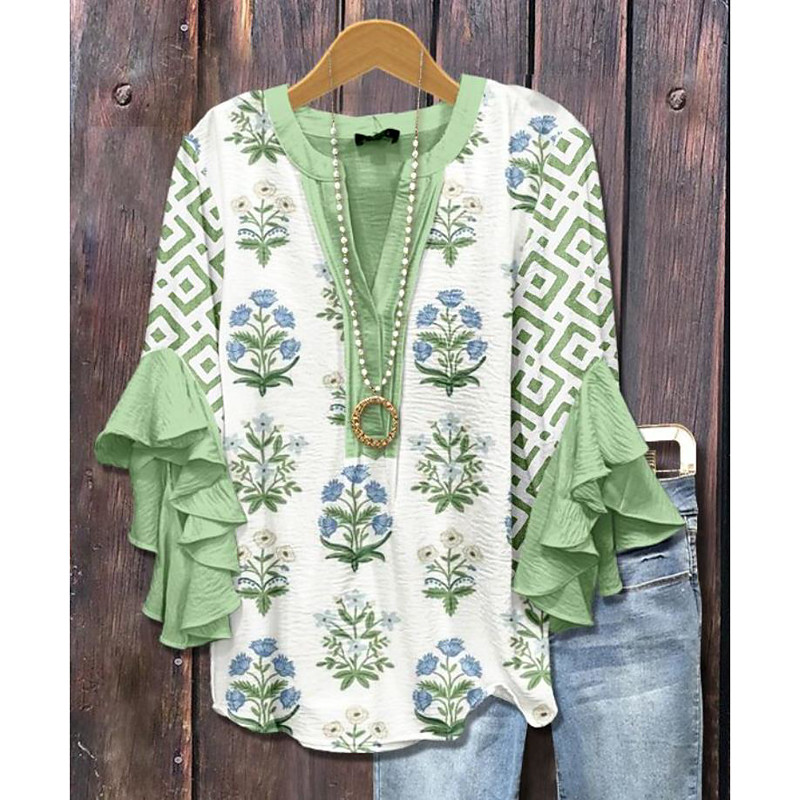 Women's Blouse V Neck Layered Ruffle Sleeve Tops Floral Graphic Striped Daily Stylish Casual 3/4 Length Sleeve Regular Tops Daily Holiday Vacation Wear Print White Blue Sky Blue Orange Green Summer