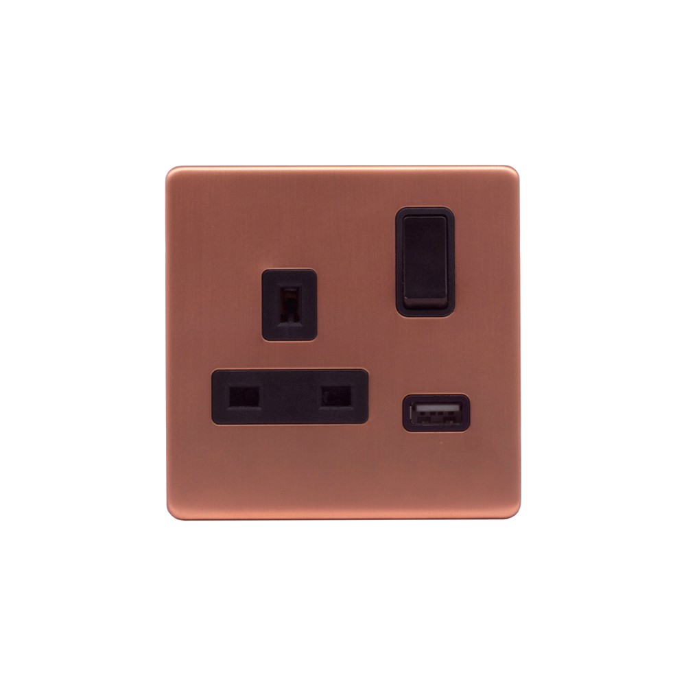 Lieber Brushed Copper 1 Gang 13A DP Socket with USB-A 2.1A - Size: 86mm x 86mm x 3.3 mm