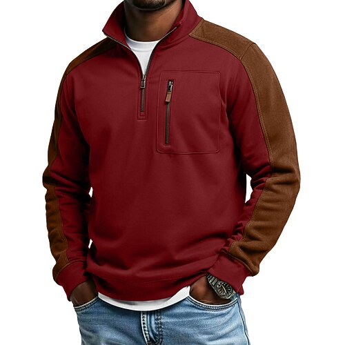 Per uomo Felpa con cappuccio Felpa con zip corta Tattico Vino Blu marino Verde Cachi Mezza zip Blocco di colori Tasca Blocco di colore Casuale Quotidiano Vintage Casual Autunno Inverno Abbigliamento