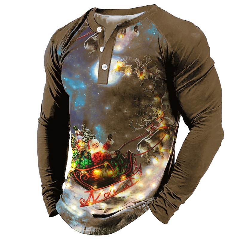 Christmas Men's Santa Claus Henley T Shirt Graphic Tee Santa Claus Collar Green Blue Purple Orange Red 3D Print Outdoor Long Sleeve Lace Up Casual Cotton