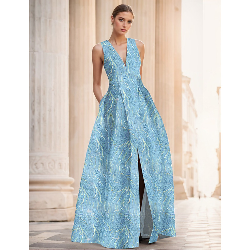 A-Line Floor Length Evening Gown Ball Gown Formal Dress Elegant Vintage Sleeveless V Neck Wedding Formal Nylon with Slit Pocket