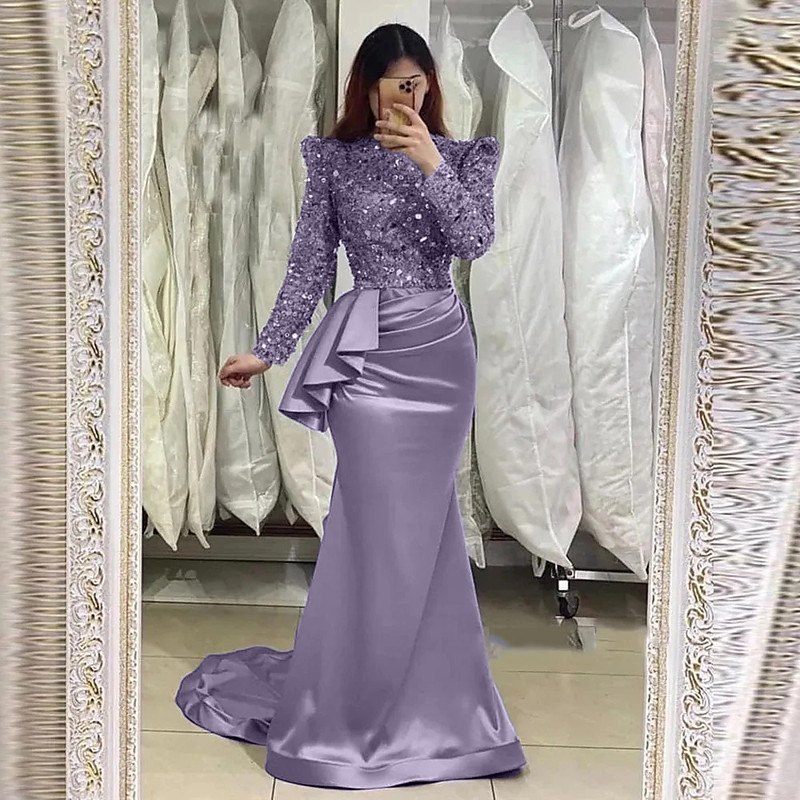 Mermaid Trumpet Floor Length Prom Dresses Evening Gown Ball Gown Formal Dress Elegant Sparkle Long Sleeve Jewel Neck Formal Satin with Sequin