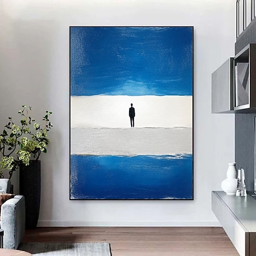 Minimalistische Strandkunst, 100 % handgemaltes blau-weißes Strand-Ölgemälde, moderne blaue Landschaft, Wohndekoration, zeitgenössische Wandkunst
