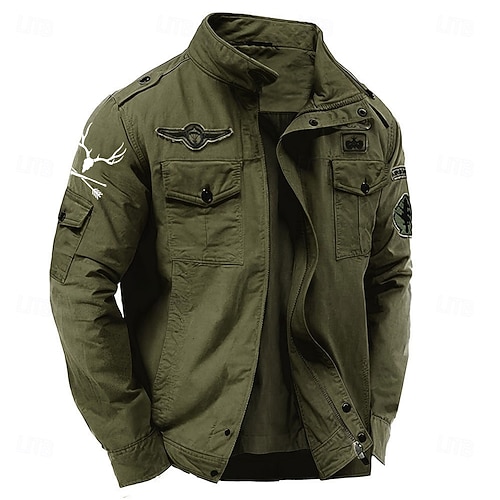 Herren Kuhmuster Cargo-Jacke Windbreaker Militärjacke Praktisch Lässig Outdoor Campen und Wandern Bestickt Seitentaschen Frontreißverschluss Herbst Winter Stehkragen Langarm Schwarz Kaki Armeegrün