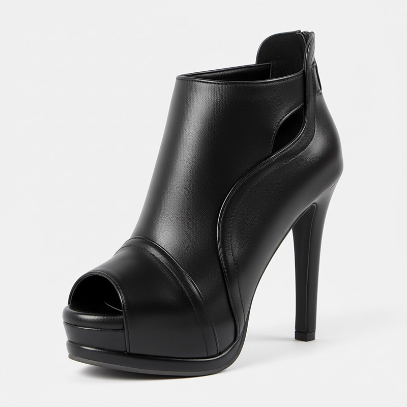 Women's Sexy Black Peep-Toe Stiletto Heels with Cut-Out Design – Faux Leather Platform Ankle Boots for Party and Evening Wear