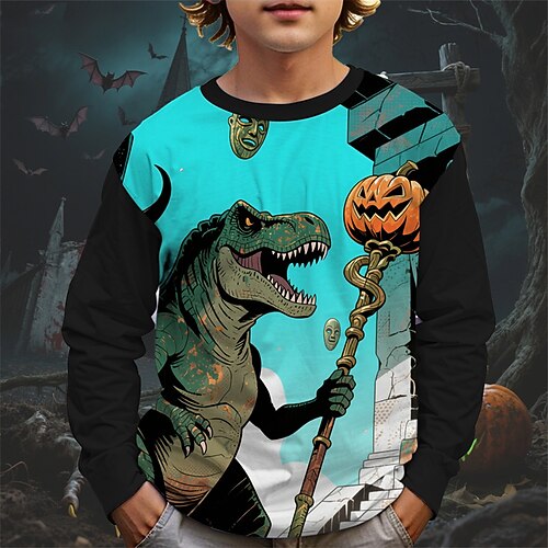 Halloween Jungen 3D Cartoon Kürbis Dinosaurier T-Shirt Langarm Frühling Herbst Mode Basic Kinder 4-12 Jahre Rundhalsausschnitt Outdoor Lässig Täglich Normale Passform