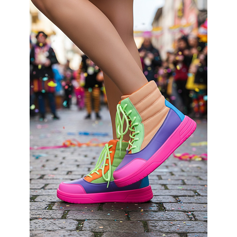 Women's Mardi Gras Colorful Carnival High-Top Sneakers with Multi-Color Panels and Laces, Fun and Vibrant Street Style Shoes for Festivals, Parties, Parades and Outdoor Adventures