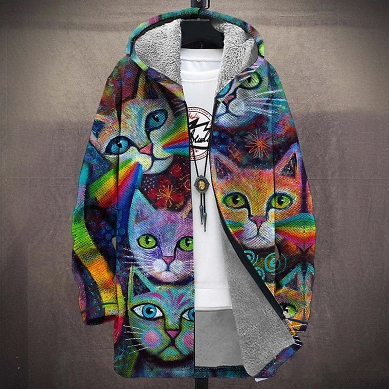 Men's Animal Cat Winter Coat Fleece Jacket Coat Thermal Warm Comfortable Casual Daily Wear Zipper Pocket 3D Print Fall Winter Hooded Long Sleeve Black Rainbow