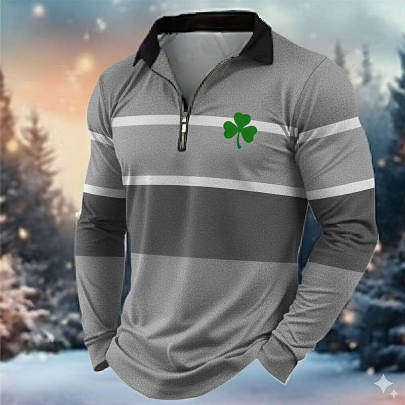 St. Patrick Men's Stripe Shamrock Polo Long Sleeve Turndown Modern Leisure Athleisure Casual Daily Festival Zipper 3D Print Spring Fall Black Green Gray