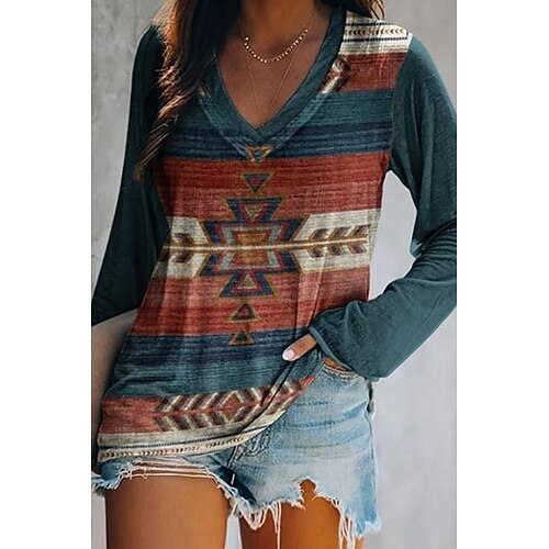 Damen T Shirt Druck Grafik Geometrisch Stammes Elegant Bohemien Vintage Langarm V Ausschnitt Normale Oberteile Täglich Ausgehen Wochenende Blau Schwarz Gelb Rote Dunkelgrün Frühling Herbst