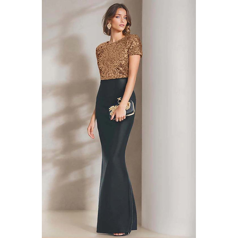 Mermaid Trumpet Floor Length Prom Dresses Evening Gown Ball Gown Formal Dress Elegant Color Block Silky Short Sleeve V Neck Evening Party Formal Belt / Sash Satin Sequined with Glitter
