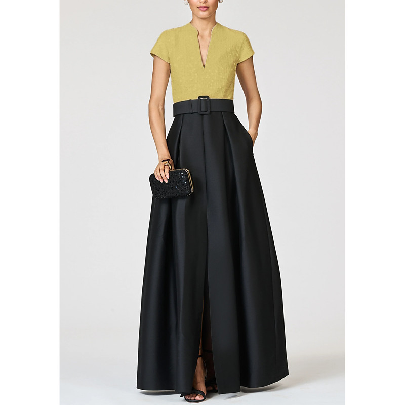 A-Line Floor Length Evening Gown Ball Gown Formal Dress Elegant Color Block Glittering Short Sleeve V Neck Wedding Formal Pocket Satin with Glitter