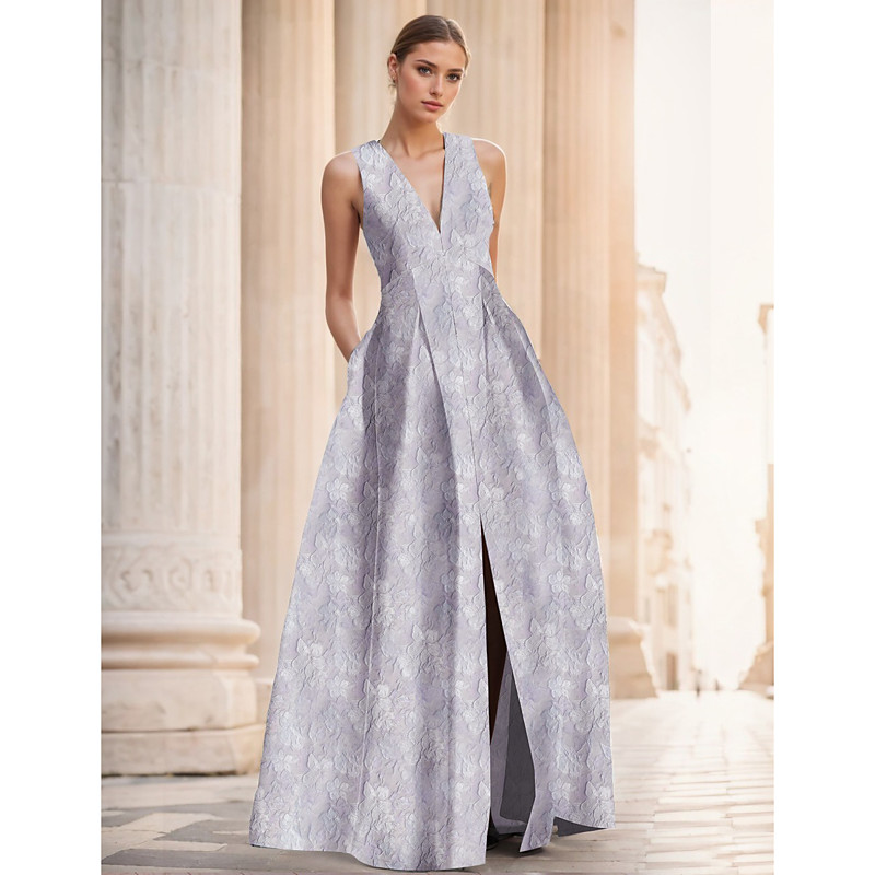 A-Line Floor Length Evening Gown Ball Gown Formal Dress Elegant Vintage Sleeveless V Neck Wedding Formal Nylon with Slit Pocket