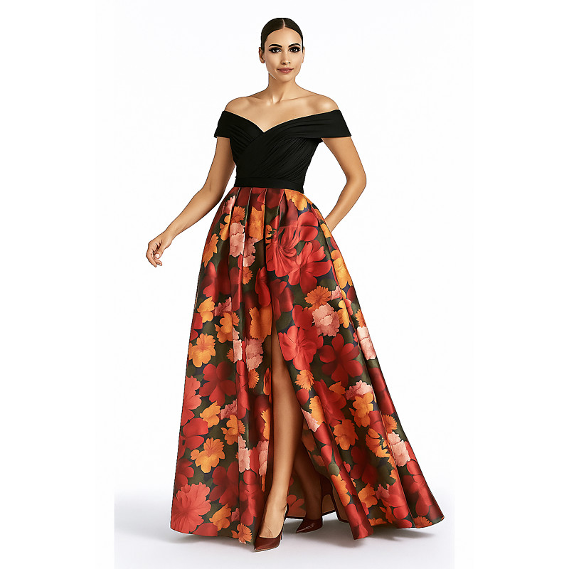 A-Line Floor Length Beaded Eembroidered Formal Dresses Mother of the Bride Dress Evening Gown Ball Gown with Overskirt Formal Dress Elegant Color Block Silky Short Sleeve Off Shoulder Wedding Formal
