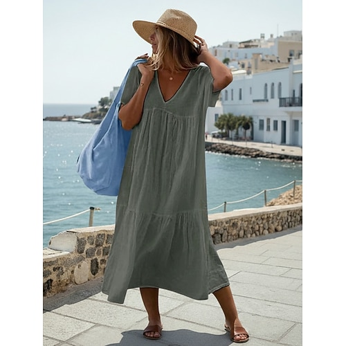 Per donna Abito Midi 100% cotone Abito in cotone e lino Moda Moderno All'aperto Vacanza Ferie Vestibilità comoda Semplice Manica Corta Scollo a V Blu Nero Bianco Verde chiaro Estate Primavera