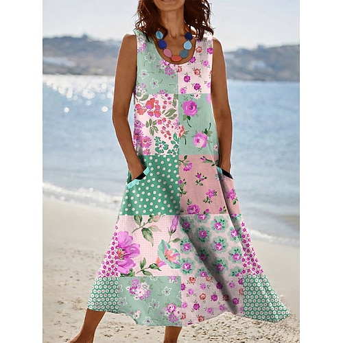 Per donna Abito Midi Vestito Estivo Abito a trapezio Vacanza Casual Boho Ferie Vestibilità comoda Floreale Grafico Senza Maniche Collo a U Blu Giallo Rosa Verde Estate Primavera