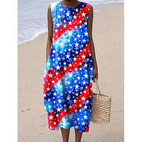 Giorno dell'Indipendenza Americana Per donna Abito Midi Abito a Tubino Vestito Estivo Vacanza Casual All'aperto Vestibilità comoda Stelle e strisce Senza Maniche Girocollo Bianco e blu Blu oceano
