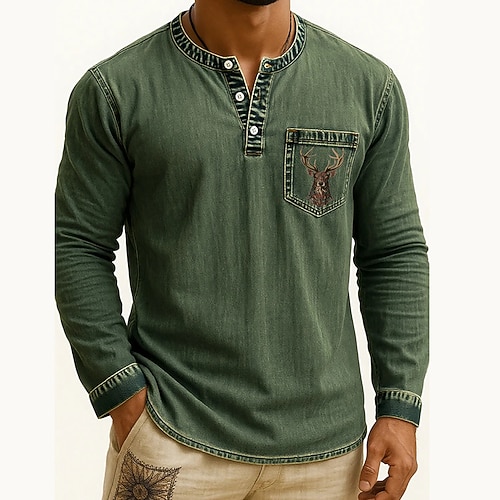 Herren Henley Hemd T-Shirt Langarmshirt Langarm Henley Herbst Winter Rentier Hirsch Mode Designer Mode Jahrgang Urlaub Straße Ausgehen Dunkel Braun Marineblau Schwarz Top T-Shirt für Herren