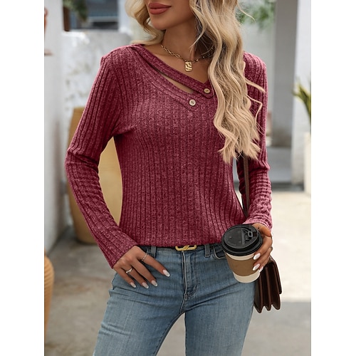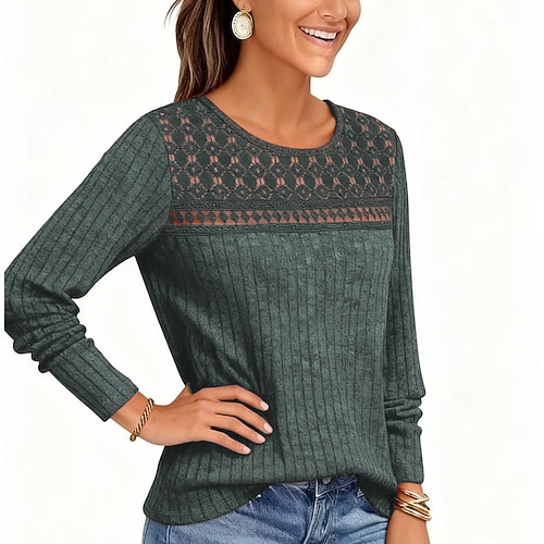 Per donna Top a maglia a coste Maglietta Vintage Casual Manica Lunga Girocollo Top Regolari Quotidiano Uscire Weekend Traforato Blu Marrone rossastro Nero Vino Verde militare Primavera Autunno