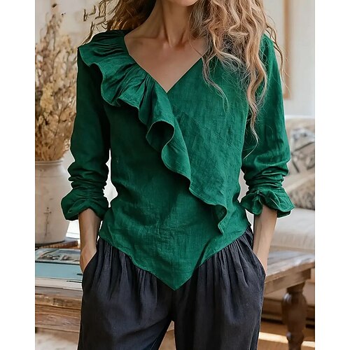 Per donna Blusa Semplice Vintage Elegante Manica Lunga Scollo a V Top Regolari Quotidiano Ferie Uscire Volant Patchwork Nero Rosso Blu marino Verde Cachi Estate Primavera Autunno