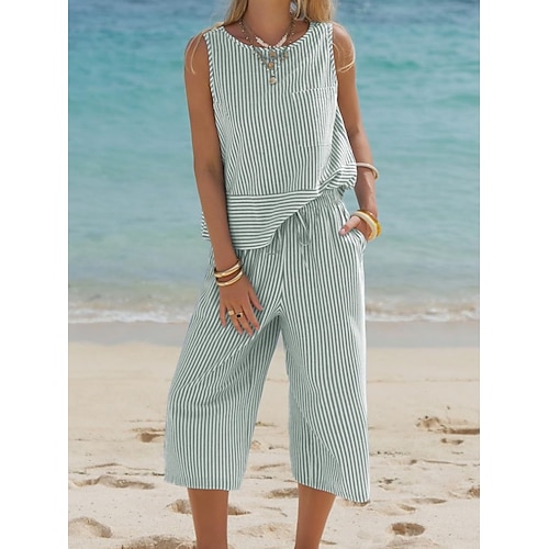 Per donna Camicie di cotone e lino Set di Pantaloni Bolero Senza Maniche Girocollo A righe Patchwork Moda Streetwear Casuale Quotidiano All'aperto Blu Nero Rosso Estate Vestibilità regolare