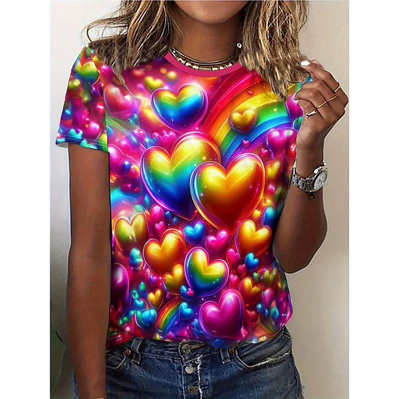 Women's T Shirt Heart Casual Short Sleeve Round Neck Regular Tops Daily Print Fuchsia Summer