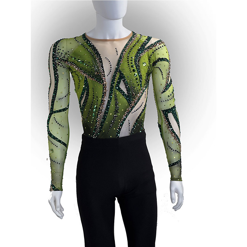 Figure Skating Top Men's Boys' Ice Skating Tops Green Patchwork Mesh Spandex High Elasticity Training Competition Skating Wear Classic Crystal / Rhinestone Long Sleeve Ice Skating Figure Skating